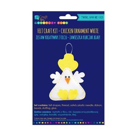 Kreativní sada pro výrobu filcové slepičky. Ideální způsob jak zabavit děti výrobou něčeho kreativního. Slepička může být hračkou nebo pěknou ozdobou dětského pokoje. Spojte dohromady všechny prvky, jak je ukázáno v návodu a je hotovo! Sada obsahuje: filcové dílky, bezpečnou plastovou jehlu, nit, stuhu, korálky, výplň a lepidlo.
