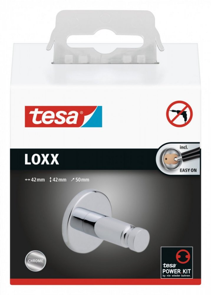 Háčik na uterák tesa® Loxx je atraktívny doplnok vašej kúpeľne s vysoko lesklým chrómovaným povrchom, ktorý je odolný voči vode a nehrdzavejúci. Zaoblený dizajn s asymetrickými prvkami pôsobí pútavým a krásnym dojmom. Na pripevnenie sa používa lepidlo, ktoré zaisťuje dostatočnú silu nielen na kúpeľňové uteráky, ale aj na župany. Nie je potrebné žiadne vŕtanie, vďaka čomu sa povrchy nepoškodia. Po 12 hodinách schnutia lepidlo dosiahne svoj najvyšší výkon. Háčik môžete kedykoľvek a bez stopy demontovať a znovu použiť s novým adaptérom BK22 na inom mieste.