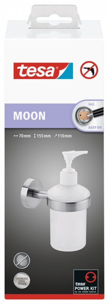 Kombináciou antikorovej ocele s nádobou zo satinovaného skla je zaoblený kúpeľňový dávkovač mydla tesa® Moon krásnym kúpeľňovým doplnkom. Jeho konzola nezachytáva odtlačky prstov. Má kapacitu 200 ml, vďaka ktorej si nemusíte odkladať pôvodnú nádobku na umývadle. Dávkovač môžete dokonale zladiť s ďalšími produktmi radu Moon. Montuje sa pomocou výkonného lepidla, ktoré po 12 hodinách schnutia dosiahne maximálne prichytenie. Veľmi rýchle je aj jeho odstránenie bez zanechania stôp a opätovné použitie na inom mieste s novým adaptérom BK20.