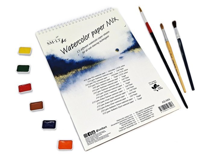 Akvarelový blok Mix ve formátu A4 obsahuje 15 listů různých akvarelových papírů s pevnou zadní stranou a spirálovou vazbou. Tento blok vám umožní otestovat a zjistit, který akvarelový papír je pro vás ten pravý. Zvolte si povrch: Cold pressed, Rough nebo Hot pressed? Potřebujete 100% bavlnu nebo méně? Jakou barvu či odstín preferujete? V tomto bloku najdete nejlepší akvarelové papíry SMLT Art s různými povrchy a gramážemi, které vám pomohou odpovědět na všechny tyto otázky.