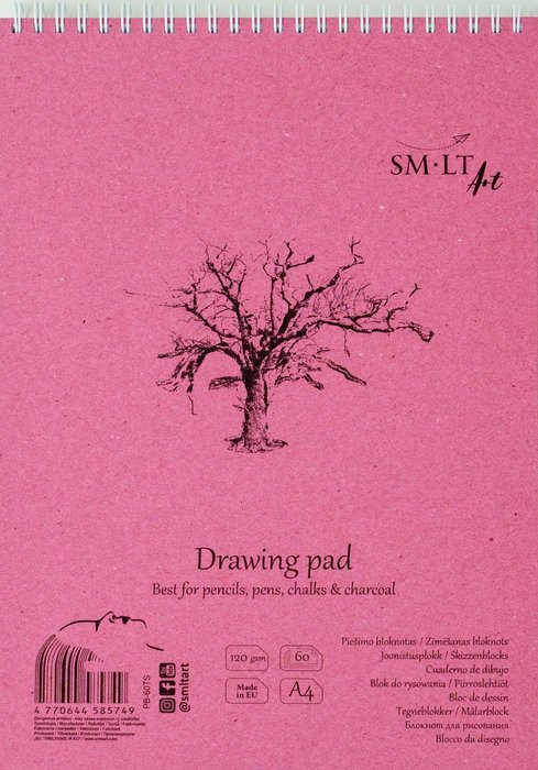 Blok A4 s bílým papírem. Snadno stíratelný povrch. Nejlepší pro tužky, pera, pastelky, křídy, uhel. Vnitřní papír neobsahuje kyseliny, má neutrální pH, je certifikován FSC a ekoznačkou EU. S obalem z přírodního barevného kartonu, tvrdým hřbetem, mikroperforovanými listy a spirálou na horní straně.