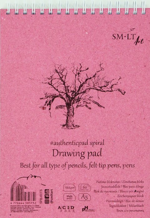 Blok A5 s bílým papírem. Snadno stíratelný povrch. Nejlepší pro tužky, pera, pastelky, křídy, uhel. Vnitřní papír neobsahuje kyseliny, má neutrální pH, je certifikován FSC a ekoznačkou EU. S obalem z přírodního barevného kartonu, tvrdým hřbetem, mikroperforovanými listy a spirálou na horní straně.