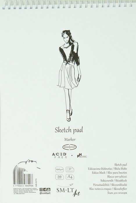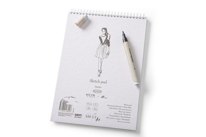 Blok s bílým, jednostranně nepropustným potahovaným papírem. Povrch je hladký a je vhodný zejména pro popisovače a gelová pera. S přírodním kartonovým obalem, pevnou zadní stranou a spirálou na horní straně. Vnitřní papír je bez kyselin, pH neutrální a má certifikát FSC.
