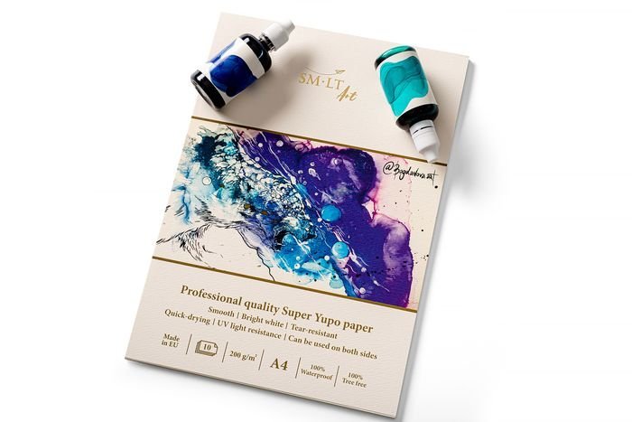 Blok Super Yupo PRO "SMLT ART". Blok má lepený pevný zadní kryt. Syntetický papír je hladký, zářivě bílý, rychleschnoucí a odolný vůči UV záření. Dá se použít oboustranně, papír je také odolný proti prachu. Vhodný pro fixy, alkoholové inkousty, akvarel a další techniky. Ideální pro kreativní a klasické práce. Vnitřní papír je 100% bez dřevin.